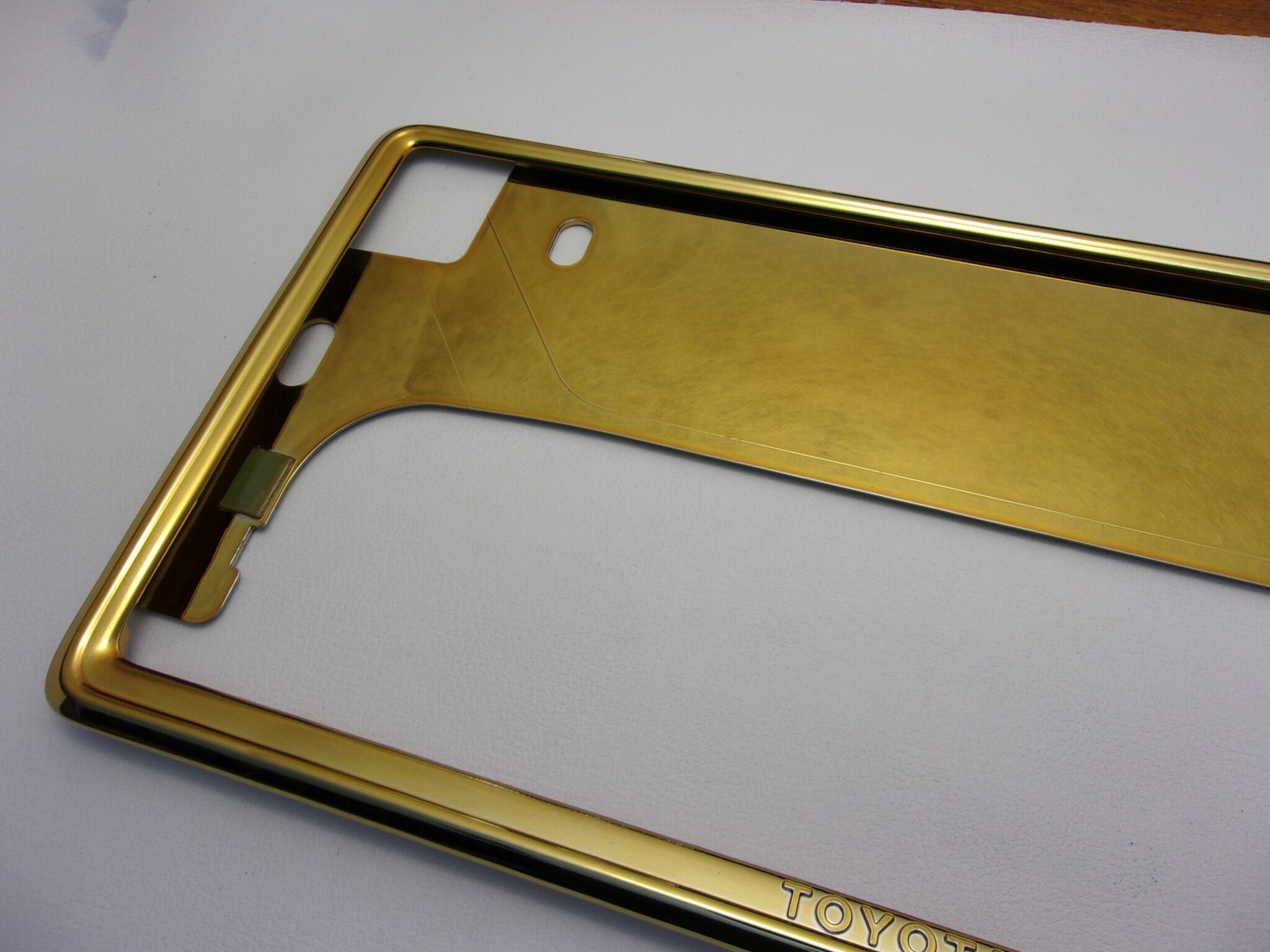 トヨタ純正クロームメッキ仕様(デラックスタイプ)のナンバーフレームを、トレジャージャパン独自の溶剤と・加工方法により、クロームメッキの輝きを活かしたゴールドナンバーフレームに仕上げました。